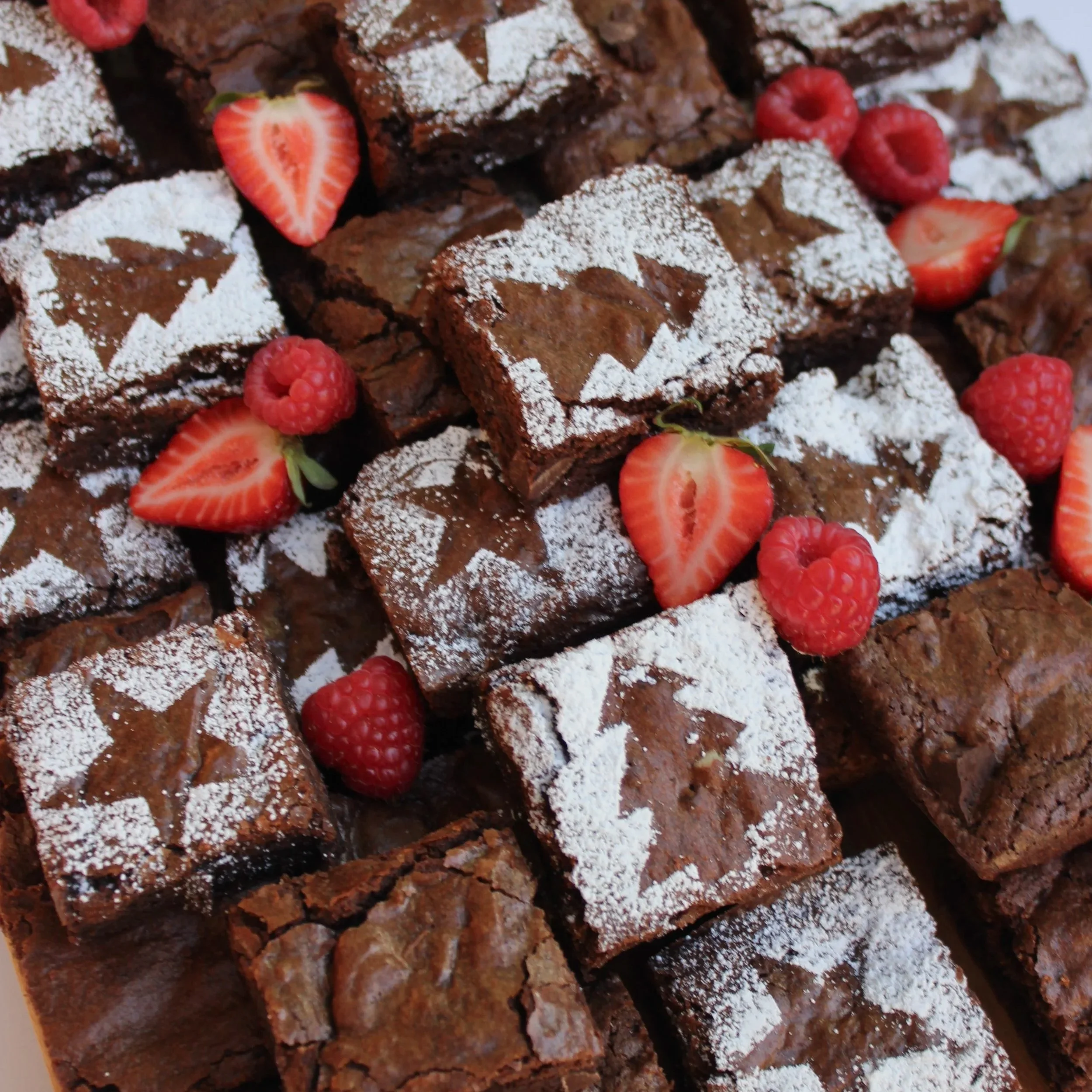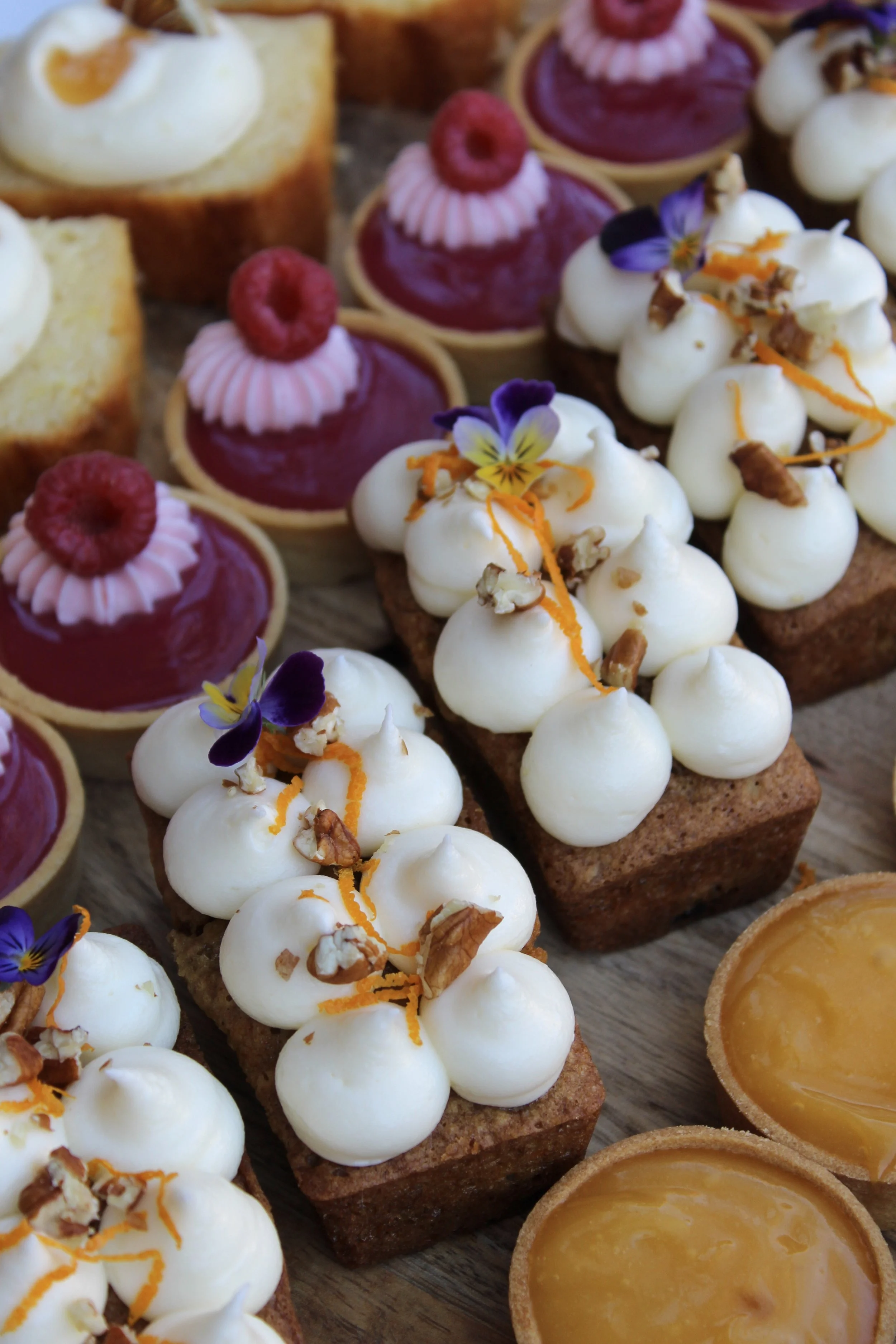 Our Signature Indulgence Selection platter featuring a beautifully balanced selection of lemon cake with lemon cream cheese icing, raspberry and passionfruit tarts, rich tiramisu brownies, and classic carrot cake finished with cream cheese icing.